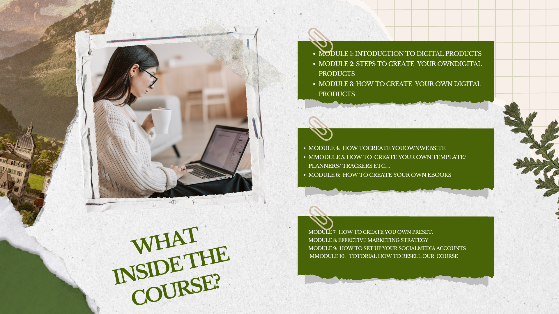 The course covers various topics, including creating digital products,building onlune courses, marketing and content strategies and reseling digital products.